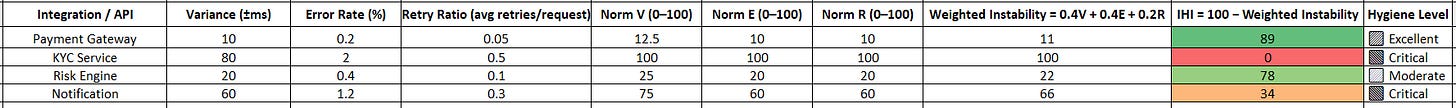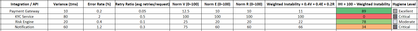 Integrations are like arteries — clean ones keep data flowing, clogged ones slow the system down. The Integration Hygiene Index forces platforms to move beyond “Is it up?” to “Is it consistent?” Because users don’t care about uptime — they care about smoothness. By measuring variance, error, and retry friction, IHI gives leaders a single lens into system reliability health.