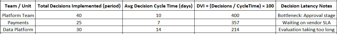 The Decision Velocity Index bridges the gap between strategy and execution speed. It turns leadership agility into a quantifiable, improvable variable — much like code latency or API response time.