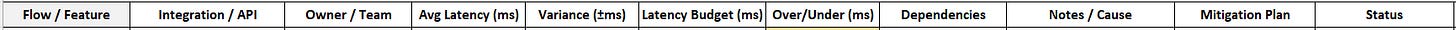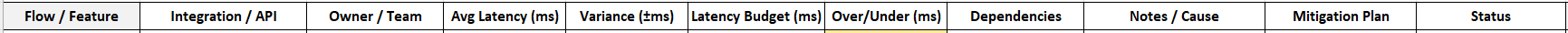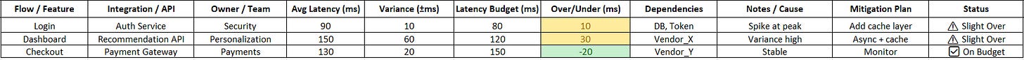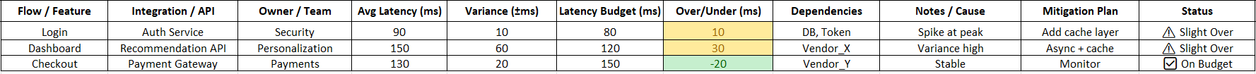 Latency debt hides because no one “owns” the milliseconds. Each team looks only at their slice — their API, their service, their deployment. But users don’t experience latency locally; they feel it cumulatively. The Latency Ledger solves that invisibility problem. It is a central accounting system for latency — a shared document or dashboard where every team logs, tracks, and owns the latency they introduce to the overall platform experience. Just like finance teams track expenses across departments, the Latency Ledger tracks performance cost across integrations, features, and dependencies.