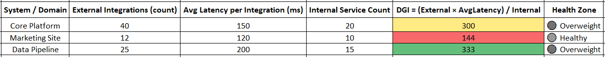 The Dependency Gravity Index (DGI) expresses total architectural heaviness through a ratio of external dependencies to internal control units (services you own). It measures how many “foreign bodies” orbit your platform and how much they slow your motion.