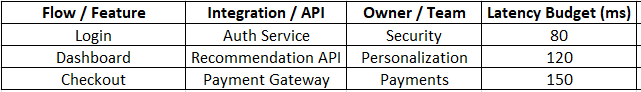 Every core user flow (login, checkout, dashboard load, etc.) should have a target latency budget — e.g., 500 ms total. Then distribute this budget across components based on business priority.