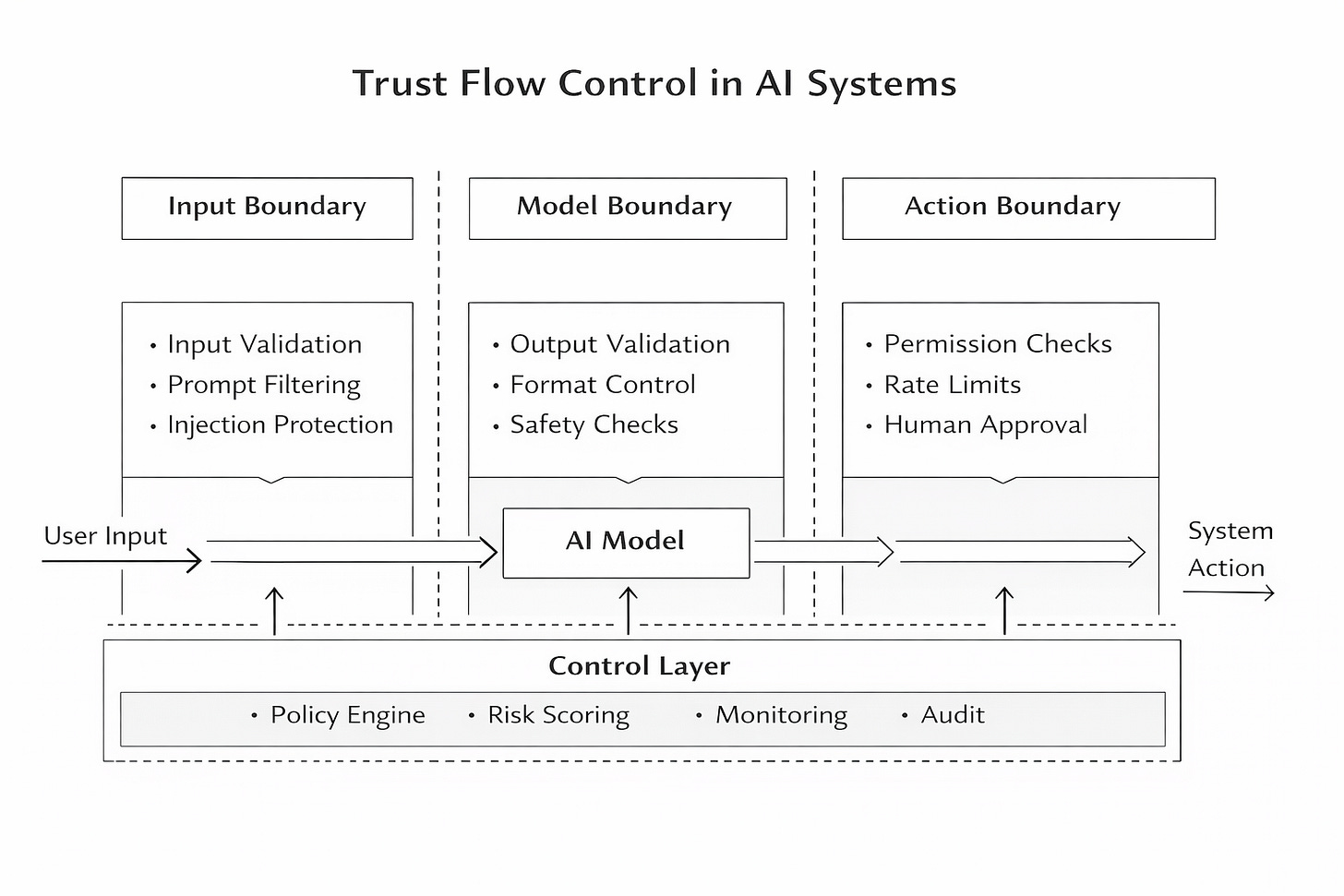 The deeper problem is that most AI systems operate with an uncontrolled flow of trust. User input flows into prompts, prompts go into the model, the model produces output, and that output leads to actions. At every step, there is an implicit assumption that things are safe. But inputs can be malicious, prompts can be manipulated, outputs can be incorrect, and actions can be irreversible. When there are no clear boundaries, even a small input can create a large and unintended impact.
